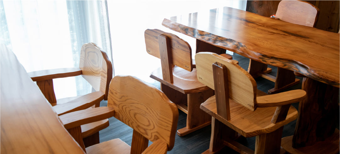 テーブルは、世界自然遺産登録地屋久島 屋久杉からできています。壁は、桜の木でサクラの香りが楽しめます。